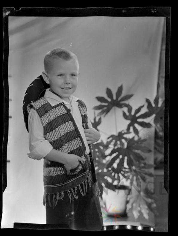 Retrato de estudio. El sobre identifica al niño como hijo de los señores Smith de la base aérea americana de Zaragoza