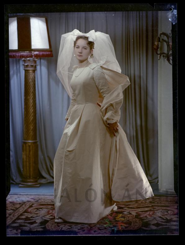 Retrato de estudio, en color, de una joven novia. Señores de Mantecón